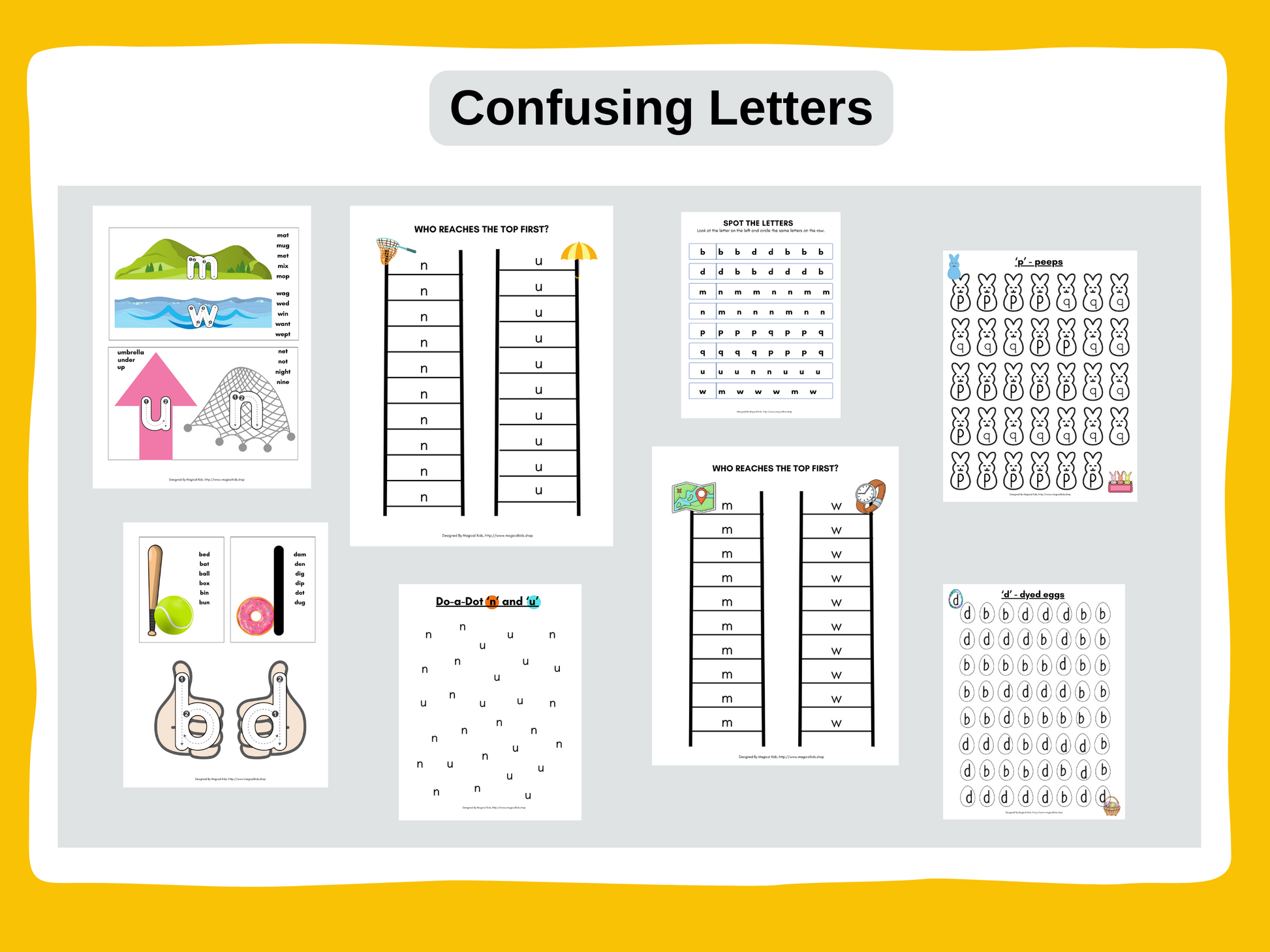 Letter posters, letter ladders, dot the letters, confusing letter cards, as well as easter themed confusing letter mazes