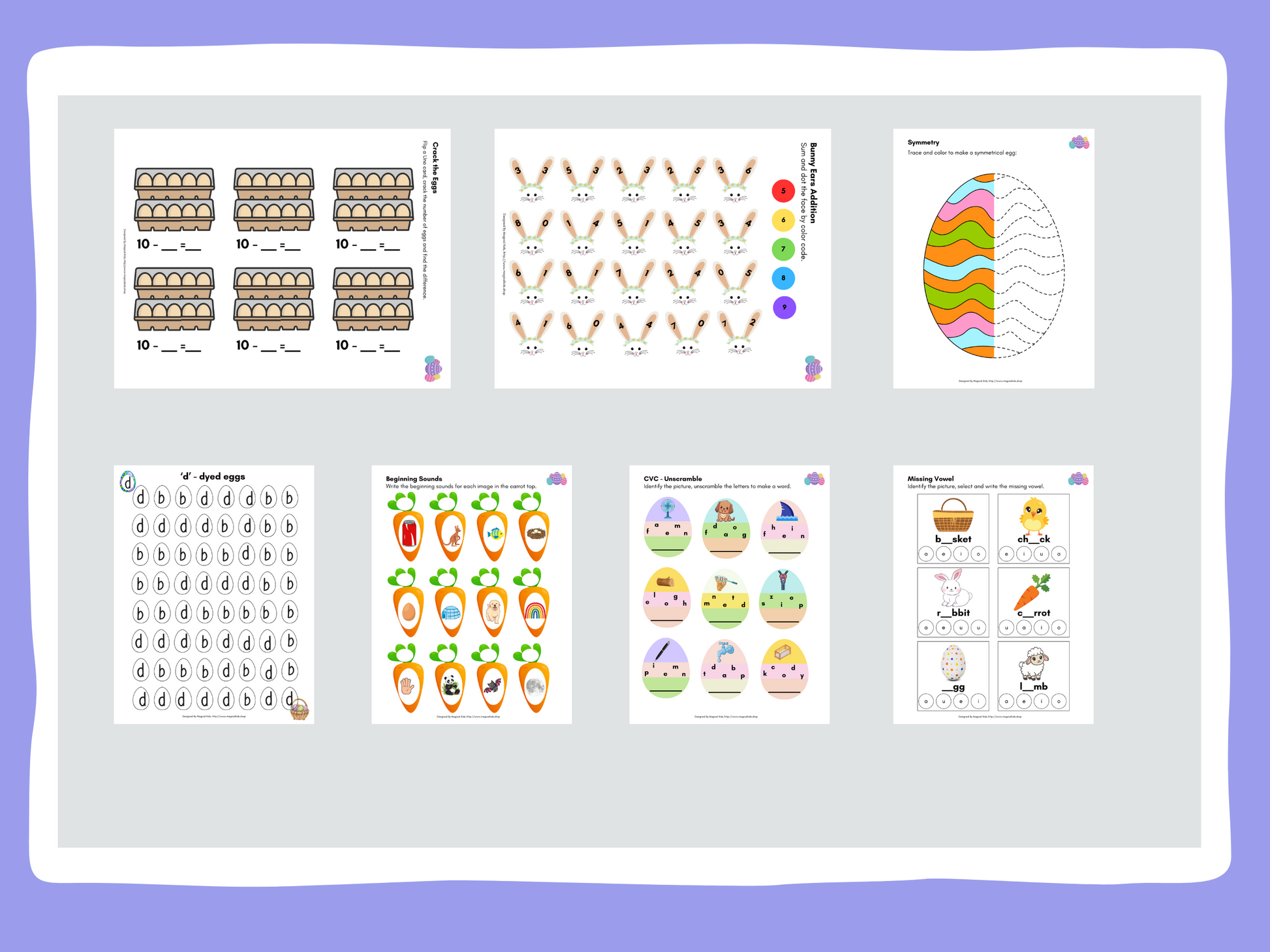 This 40-page ebook provides comprehensive coverage of essential early learning concepts such as colors, shapes, letter tracing, letter confusion, beginning sounds, short vowels, cvc words, counting, number names, addition, subtraction, logical reasoning, patterns, symmetry, and coloring activities.