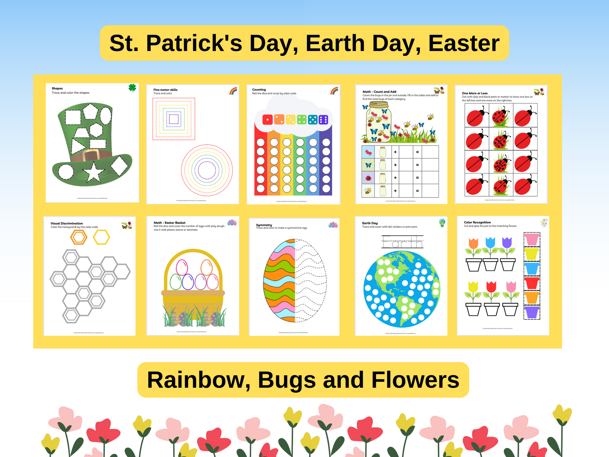115 pages book, featuring themes like St. Patrick's Day, Earth Day, Spring, and Easter. Through interactive pages with rainbows, bees, butterflies, caterpillar and flowers, children can engage in creative and engaging learning experiences.